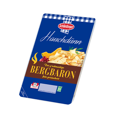 Erhältlich ist der neue Bergbaron geräuchert als Scheibenpackung hauchdünn 150 g sowie als Stück in der wiederverschließbaren 250 g Packung.