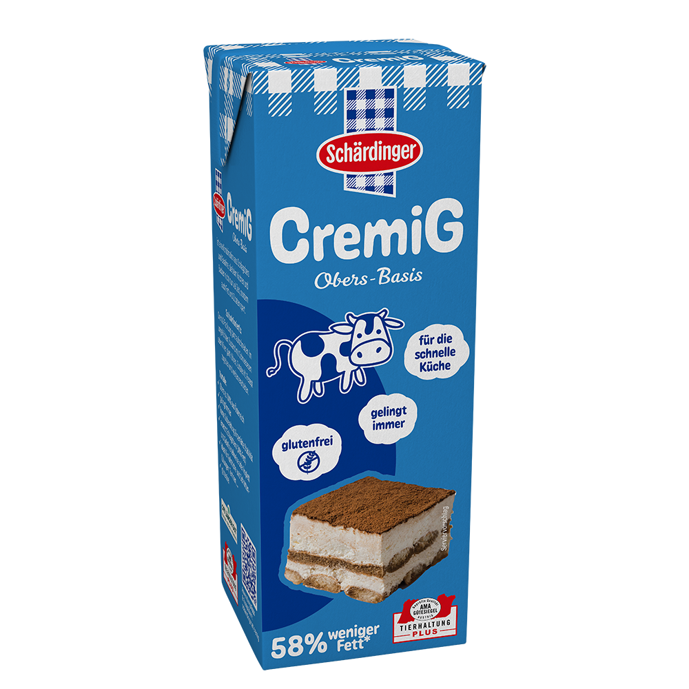 Schärdinger CremiG ist ein natürliches Milchprodukt aus Obers und Gelatine. Das Obers wird aus bester Schärdinger Milch, die zu 100% aus Österreich kommt, hergestellt. Die Gelatine stammt vom Rind.