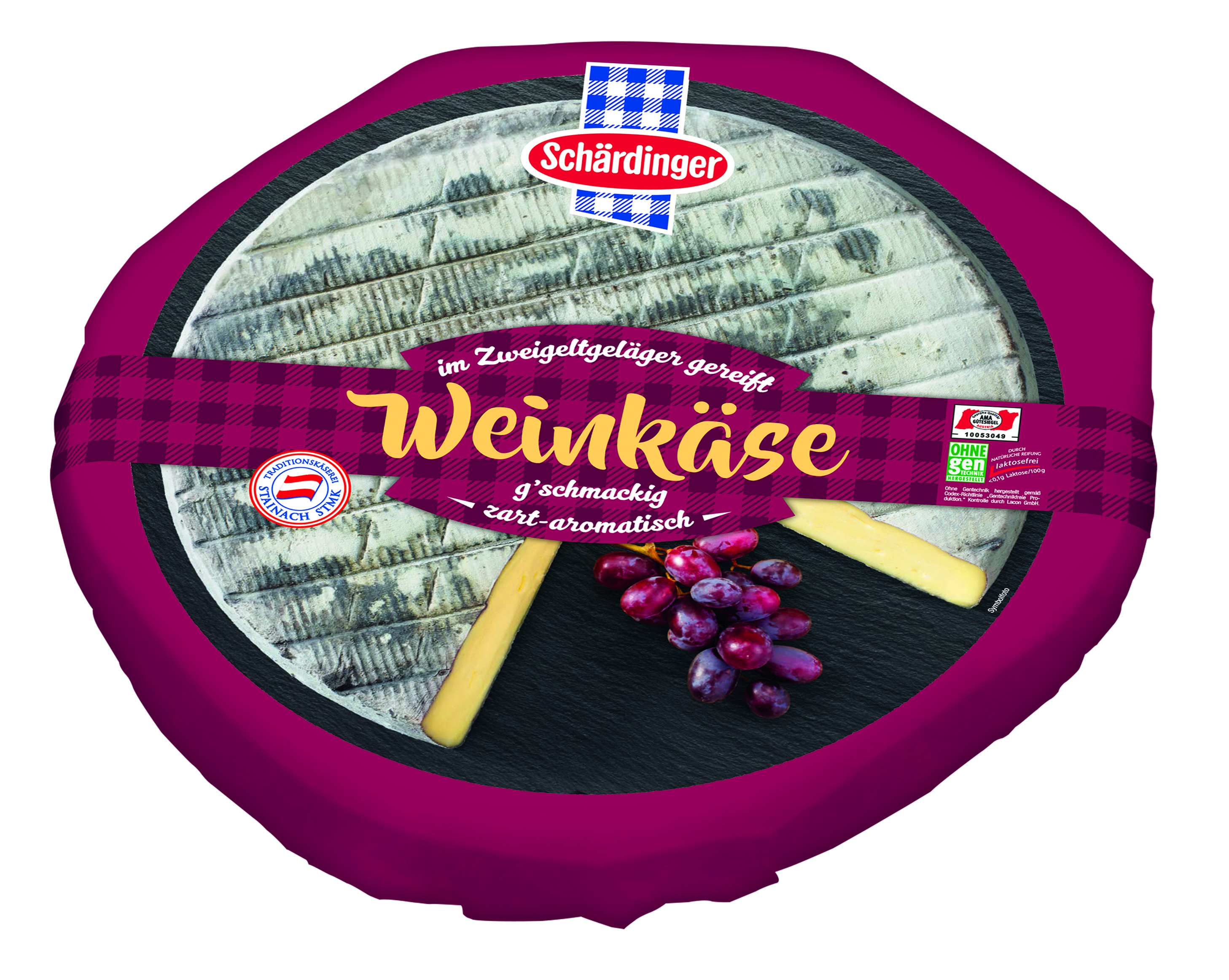 Der Schärdinger Weinkäse ist ein Weichkäse mit Naturrinde, der in Zweigeltgeläger reift und dadurch seinen fruchtig, säuerlichen Geschmack und seine dunkle Rinde erhält. Der Weinkäse wird handgekäst und während seiner Reifezeit mehrmals mit einem Zweigeltgeläger eingerieben. Dadurch erhält er seine typisch dunkle Rinde, die der Milchschimmel im Lauf der Reife mit einem weißen Flaum überzieht. Die Rinde ist das Qualitätsmerkmal dieses edlen Käses und sollte auf jeden Fall mitgegessen werden.