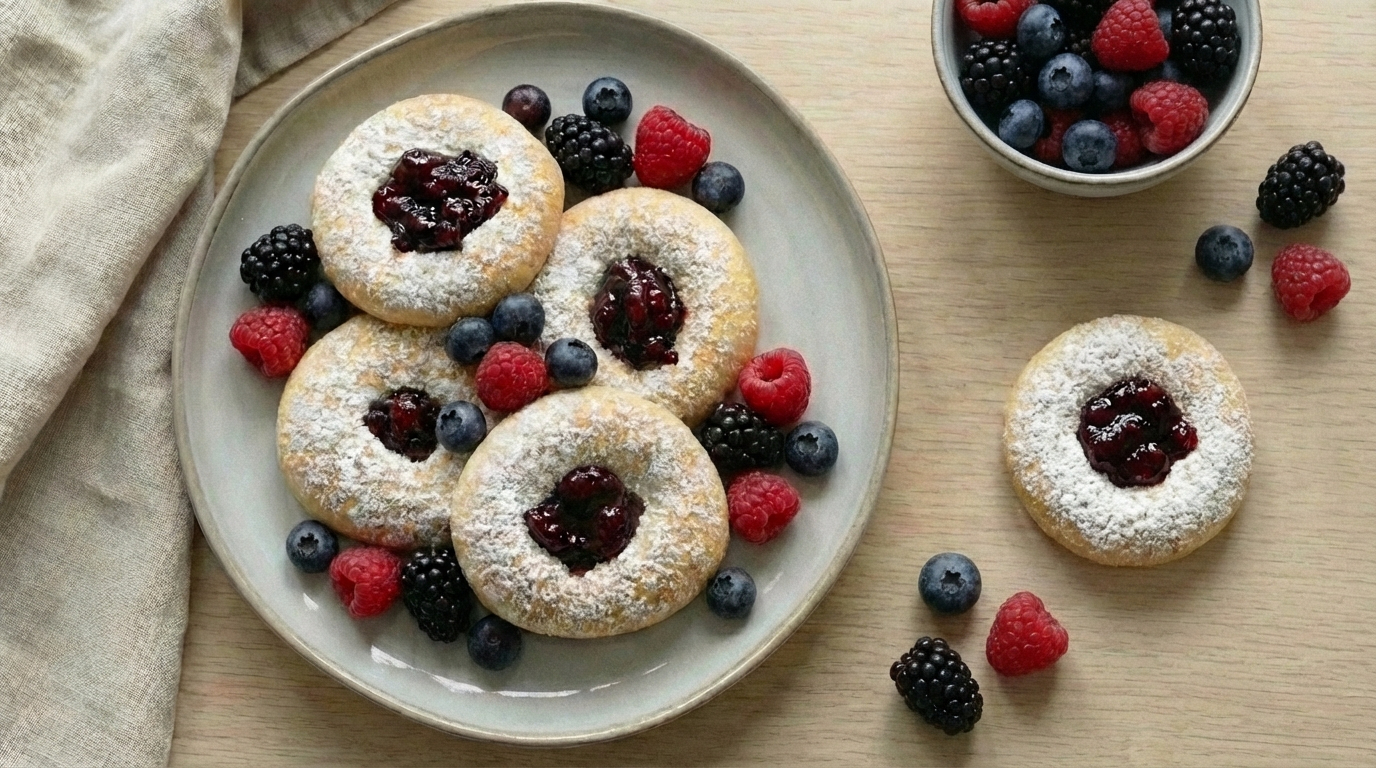 7. Kräftig mit Staubzucker bestreuen und in die Mitte einen Klecks Marmelade geben.