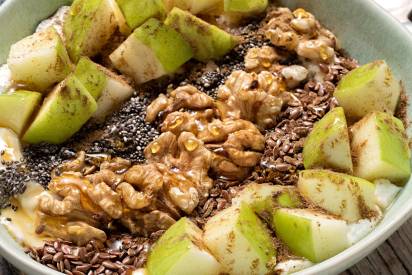 ZubereitungDen Magertopfen und das Naturjoghurt mit Zitronensaft und Honig cremig verrühren und in zwei Schalen füllen.Einen Apfel in Stücke schneiden und mit etwas Zitronensaft beträufeln.Die Apfelstücke gemeinsam mit Walnüssen, Chia Samen und Leinsamen auf den Bowls verteilen und je nach Belieben mit Zimt bestreuen. Zubereitungsdauer10 MinutenSchwierigkeitsgradLeichtMengenangabe für2 Personen Zur Übersicht Weitere Genusstipps Cremiger Cheesecake1 Stunde 50 MinutenMittel4/5 Kräutersalat mit gegrilltem Camembert30 MinutenLeicht5/5 Bananenpudding45 MinutenLeicht5/5 Oster-Cupcakes75 MinutenLeicht5/5 Frozen Yogurt Cups15 MinutenLeicht5/5 Sommerlicher Flammkuchen20 MinutenLeicht5/5