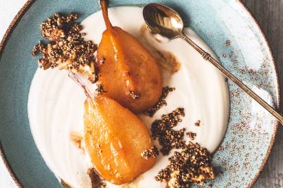 ZubereitungWalnüsse in der Pfanne mit Butter anbräunen.Birnen schälen, in der Hälfte teilen und ebenso in der Pfanne anbraten.Vanillezucker, Zucker und Honig dazugeben und alles gemeinsam karamellisieren lassen.Pro Portion 3 EL Naturjoghurt mit jeweils mit 2 karamellisierten Birnenhälften anrichten und mit den Walnüssen garnieren. Zubereitungsdauer10 MinutenSchwierigkeitsgradLeichtMengenangabe für4 Personen Zur Übersicht Weitere Genusstipps Bratkäse-Döner 15 MinutenLeicht5/5 Sommerlicher Flammkuchen20 MinutenLeicht5/5 Festtagsplatte20 MinutenLeicht4/5 Dutch Baby mit Äpfeln40 MinutenLeicht5/5 neuWhipped Camembert75 MinutenLeicht5/5 Pizza Margherita 30 MinutenLeicht5/5