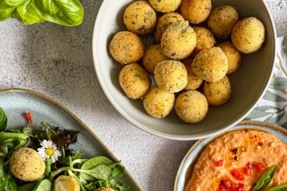 Für die Panier schneidet ihr die Kräuter klein und vermengt diese mit den Semmelbröseln, ebenso vermengt ihr Ei, Milch, Öl und Salz. Die Minis zuerst im Mehl wälzen, dann in die Eimasse zum Baden und zu guter Letzt in die Kräuterbrösel. Wer will, paniert die Minis doppelt, mit Ei und Kräuterbrösel. Die panierten Kugerl für ein paar Stunden in den Tiefkühler geben, weil sie dann besser zum Frittieren sind.